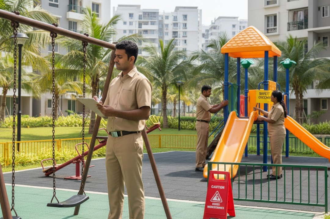 Safe and hygienic maintenance of children’s play areas with regular inspections and upkeep.